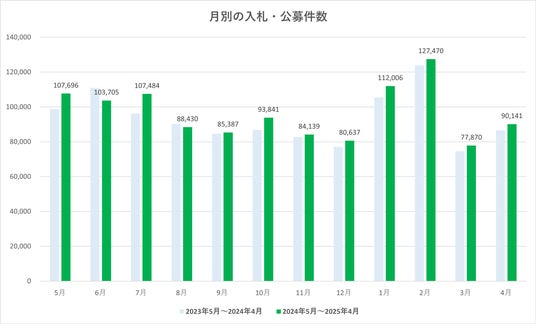 2025年4月の入札・公募件数は90,141件で、前月から約12,000件の増加となりました。前年同月比では3,000件以上の増加ですが、例年と比べて特に大きな変動があったわけではありません。