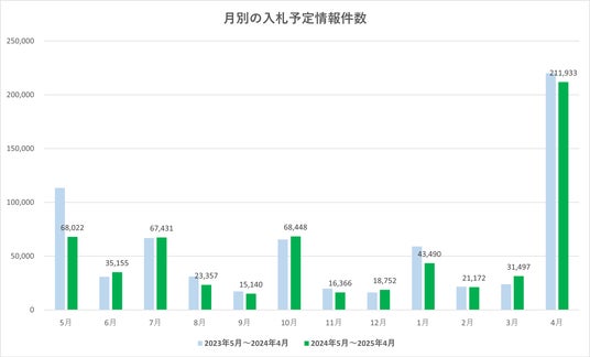 2025年4月には、新年度の開始に伴い、多数の入札予定情報(発注見通し)が登録されました。件数は211,933件で、前年同月(2024年4月)よりわずかに減少していますが、他の月と比較して圧倒的に多い件数となっています。