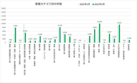 新年度に向けて多数の案件が登録されていた「建物等の維持管理(清掃・警備・受付等)」は、4月に入り件数が大きく減少しました。一方で、「デザイン・印刷・広告」や「空調・換気・給排水・衛生機器及び工事」では案件数が大幅に増加しました。