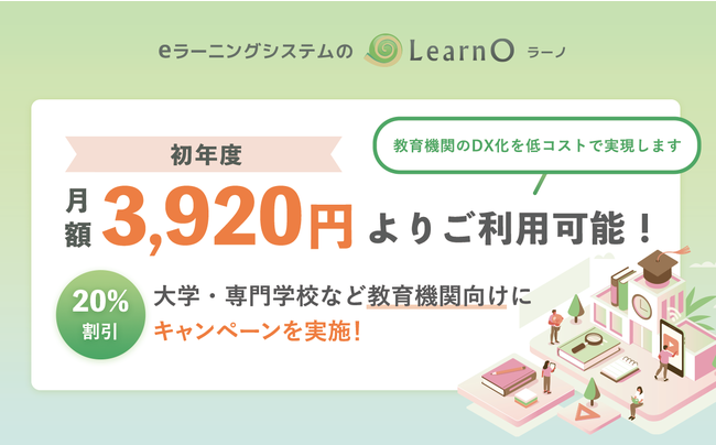 この度、2022年12月までに「LearnO」をご契約いただいた教育機関(高等学校、専門学校、大学など)のお客様に限り、初回1年間の費用を20%OFFとするキャンペーンを実施いたします。これにより、月額最低3,920円(税抜)※よりLearnOをご利用いただけます。