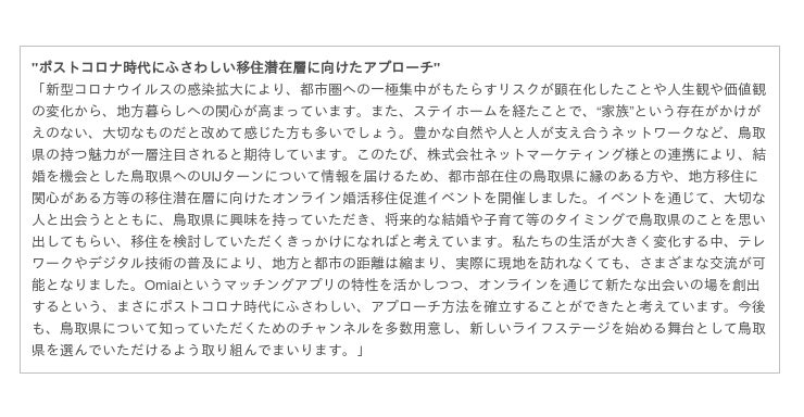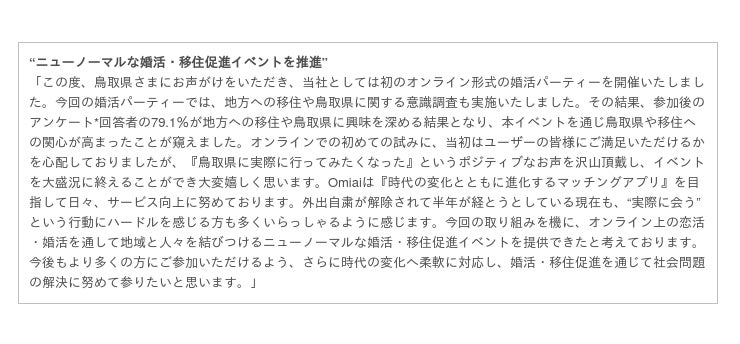 株式会社ネットマーケティング(本社:東京都港区、代表取締役社長兼CEO:宮本 邦久)が運営する恋活・婚活マッチングアプリ「Omiai」は、このたび鳥取県と共催で、鳥取県の魅力に触れられるオンライン婚活イベント「鳥取県×Omiai縁結びパーティー ~TOTTORI HOLIDAYS~」を11月7日(土)と11月14日(土)にそれぞれ関東・関西エリア在住者向けに開催いたしました。イベントには両エリア合わせて22~35歳を対象に男性26名、女性17名の合計43名が参加し、計9組がマッチングをいたしました。