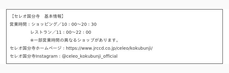 内容:セレオ国分寺公式インスタグラム(@celeo_kokubunji_official)をフォローの上、アニバーサリーボード企画に参加し画像をDMでお送りただいた方の中から抽選で10名様に素敵な賞品をプレゼント。