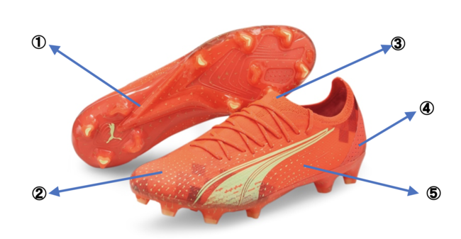 プーマ独自の軽量ウーブン素材「ULTRAWEAVE(ウルトラウィーブ)」を初めてスパイクに採用し、その表面を「PWRPRINT(パワープリント)」テクノロジーでコーティングすることで、足にしっかりとフィットしながら安定性とサポート力を高め、パフォーマンス中のスピードを維持します。また、PWRPRINTテクノロジーをアッパーの主要な部分に採用することで、スパイクの軽量性を維持しながらもサポート力を高めています。アウトソールに使用している「SPEEDPLATE(スピードプレート)」は、高反発特殊素材とポリウレタンの2種類の素材を合わせたアウトソールで、反発性と屈曲性を兼ね備えた「SPEEDPLATE」により、プレー中の推進力とエネルギー伝達を強化します。