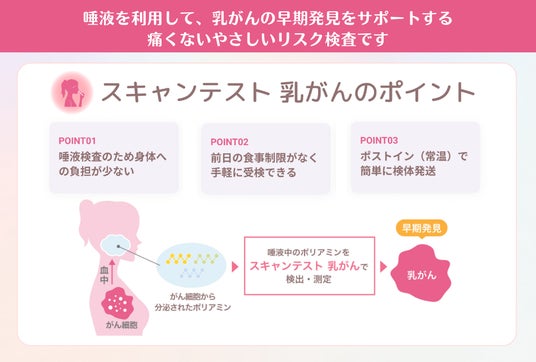 「スキャンテスト 乳がん」は、乳がん患者で変化する唾液中の代謝物のバランスを調べて、乳がんの早期発見をサポートする高精度なリスク検査です。