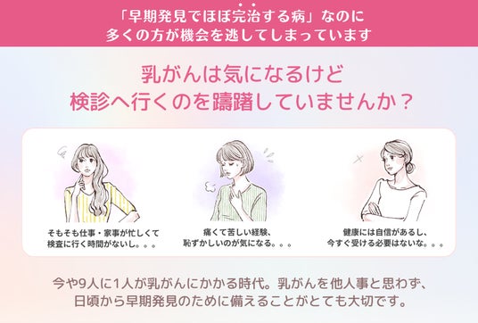 乳がんは早期発見でほぼ完治すると言われていますが、多くの女性が検診の機会を逃してしまっています。乳がんが気になるけれど、乳がん検診へ行くことをためらわれている女性の方々にこそ試してほしい、手軽でやさしい検査方法です。