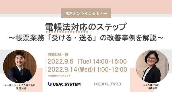 ユーザックシステムとコクヨは、こうしたアンケートの声を反映し、電子帳簿保存法への対応業務を効率化している成功事例を取り上げます。業務改善の進め方や効率化ソリューションの紹介を、オンラインセミナーに凝縮しお届けいたします。