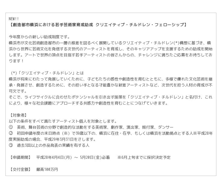 【創造都市横浜における若手芸術家育成助成クリエイティブ・チルドレン・フェローシップ】