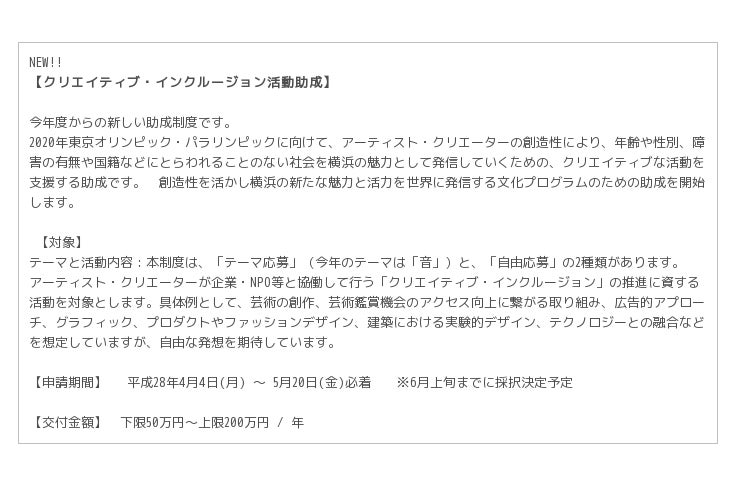 公益財団法人横浜市芸術文化振興財団は、アーツコミッション・ヨコハマ(ACY)を通じて、