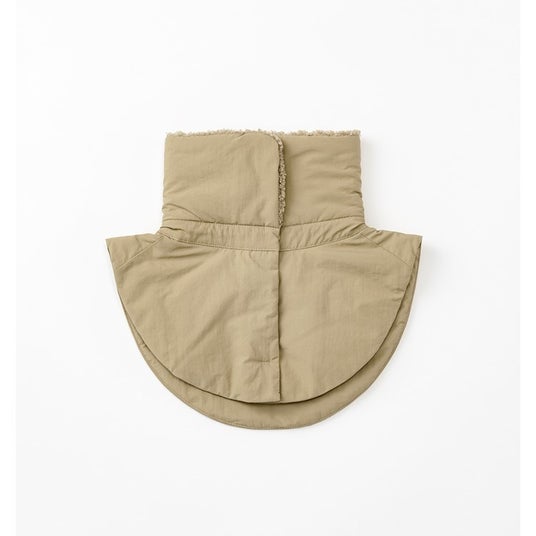 子どものよだれから服を守るため、従来のネックウォーマーより身頃部分を大きくしたデザインが特徴です。アウターの上からも纏うことができ、スタイリッシュさを際立たせるラウンドフォルムに整えました。