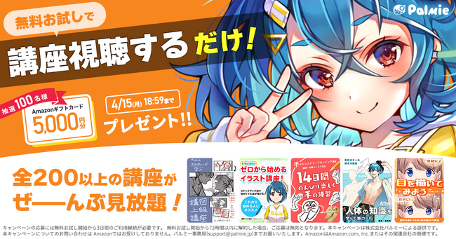 株式会社パルミー(所在地:東京都港区、代表取締役:大野英紀、以下パルミー)は、本日2024年4月5日(金)12時00分~2024年4月15日(月)18時59分までの期間、パルミーを無料お試しした方の中から抽選100名様にAmazonギフトカードをプレゼントするキャンペーンを開催いたします。