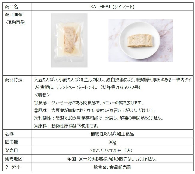 森永製菓株式会社(東京都港区芝、代表取締役社長・太田 栄二郎)は、森永製菓の独自技術を生かした大豆たんぱくと小麦たんぱくを主原料とするプラントベースミート「SAI MEAT(サイ ミート)」を9月20日(火)より、業務用ルート向けに新発売いたします。