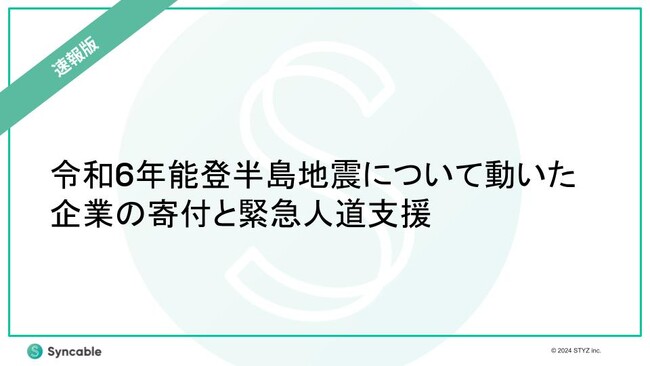 寄付プラットフォームSyncableを運営する株式会社STYZが『令和6年能登半島地震について動いた 企業の寄付と緊急人道支援』としてホワイトペーパーを無料公開。