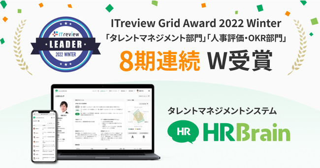 この度「HRBrain」は、「ITreview Grid Award 2022 Winter」のタレントマネジメント部門、および人事評価・OKR部門において「Leader」を8期連続でW受賞いたしました。