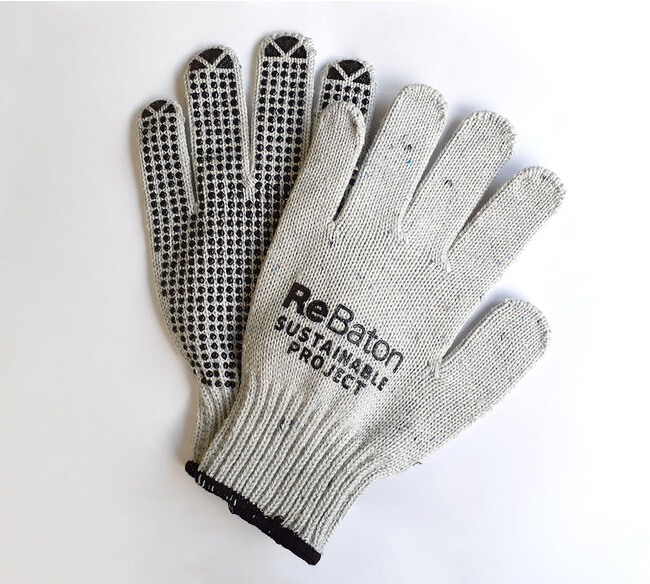 ・第1弾アイテム ReBaton ワークグローブ素材:ポリエステル、綿、その他(リサイクル素材)価格:¥1,000(税込¥1,100)この製品は、主に企業から回収した使用済ユニフォームを再資源化(反毛)した糸で織られています。※写真のグローブは株式会社ユニフォームネットの制服一新の際に出た使用済み事務服&ブルゾン(約100kg)を再資源化し、その再生繊維を7%使用しています。その他、ポリエステル素材を溶解・成型したプラスチックの日用雑貨も企画中。プロジェクトを活用する方々に喜んでいただけるような製品を増やしてまいります。