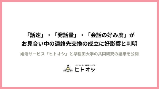 株式会社Parasol(本社:東京都港区、代表取締役:伊藤早紀)は、早稲田大学人間科学学術院の菊池英明研究室との共同研究により、婚活のお見合いにおける連絡先の交換成立には、年収差や年齢差等の判断軸よりも「話速」・「発話量」・「会話の好み度」が重要であることが明らかになりました。