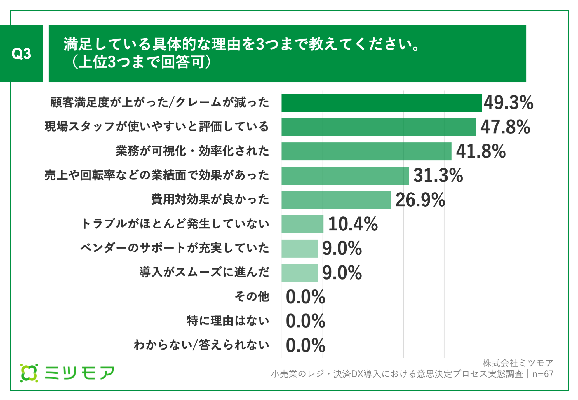 Q2で「非常に満足している」「やや満足している」と回答した方に、「Q3.満足している具体的な理由を3つまで教えてください。(上位3つまで回答可)」(n=67)と質問したところ、「顧客満足度が上がった/クレームが減った」が49.3%、「現場スタッフが使いやすいと評価している」が47.8%、「業務が可視化・効率化された」が41.8%という回答となりました。