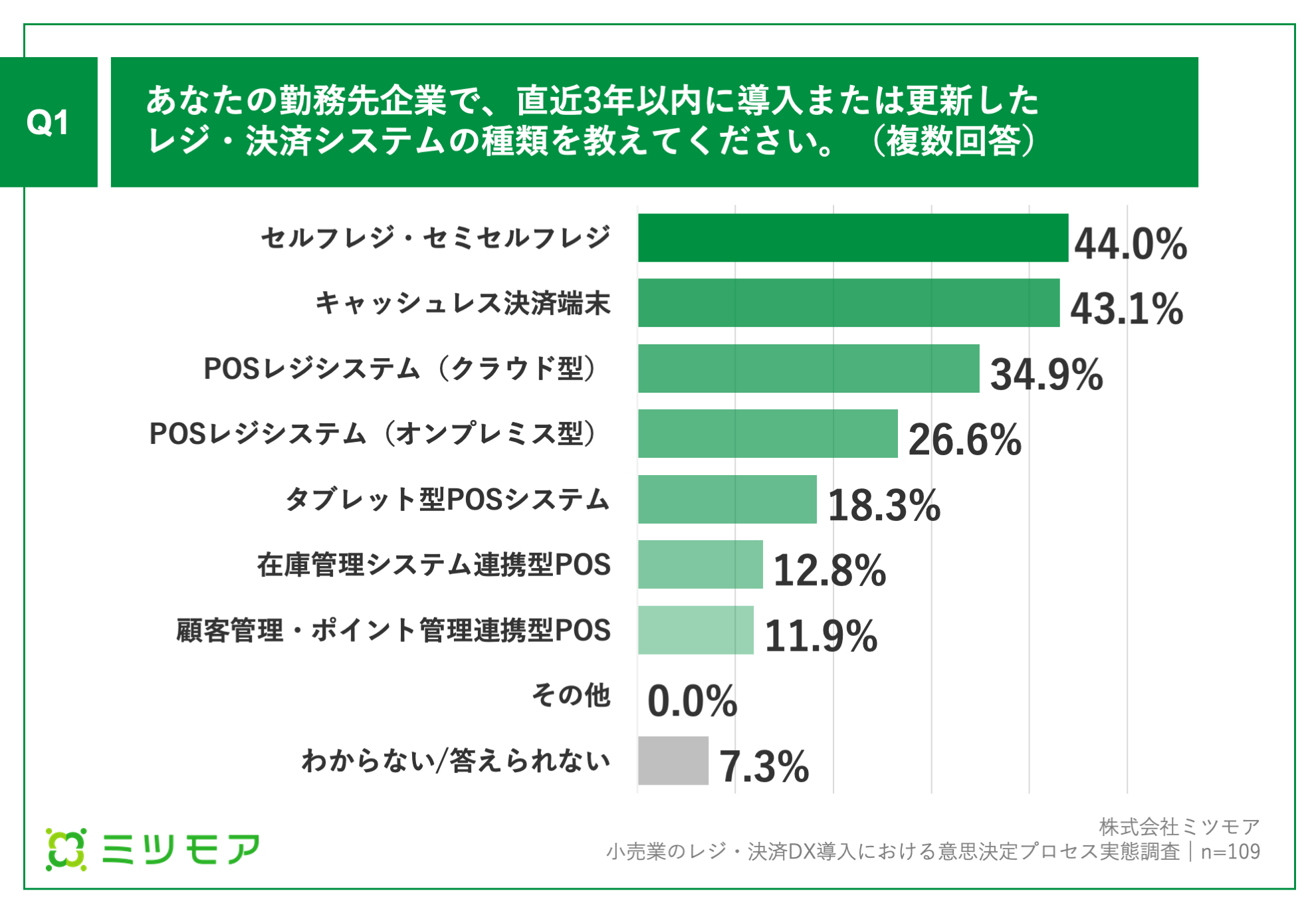「Q1.あなたの勤務先企業で、直近3年以内に導入または更新したレジ・決済システムの種類を教えてください。(複数回答)」(n=109)と質問したところ、「セルフレジ・セミセルフレジ」が44.0%、「キャッシュレス決済端末」が43.1%という回答となりました。