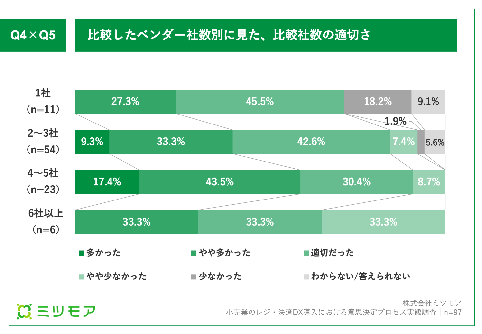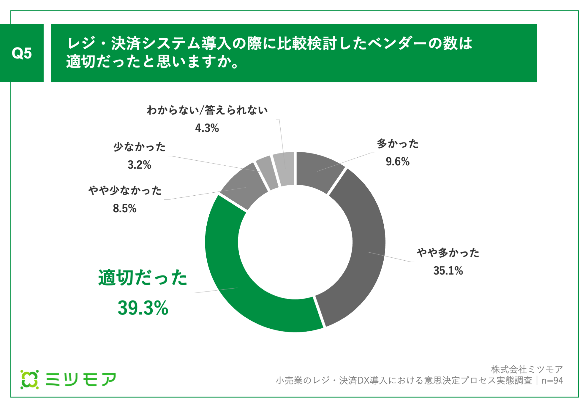 Q4で「わからない/答えられない」以外を回答した方に、「Q5.レジ・決済システム導入の際に比較検討したベンダーの数は適切だったと思いますか。」(n=94)と質問したところ、「適切だった」が39.3%という回答となりました。
