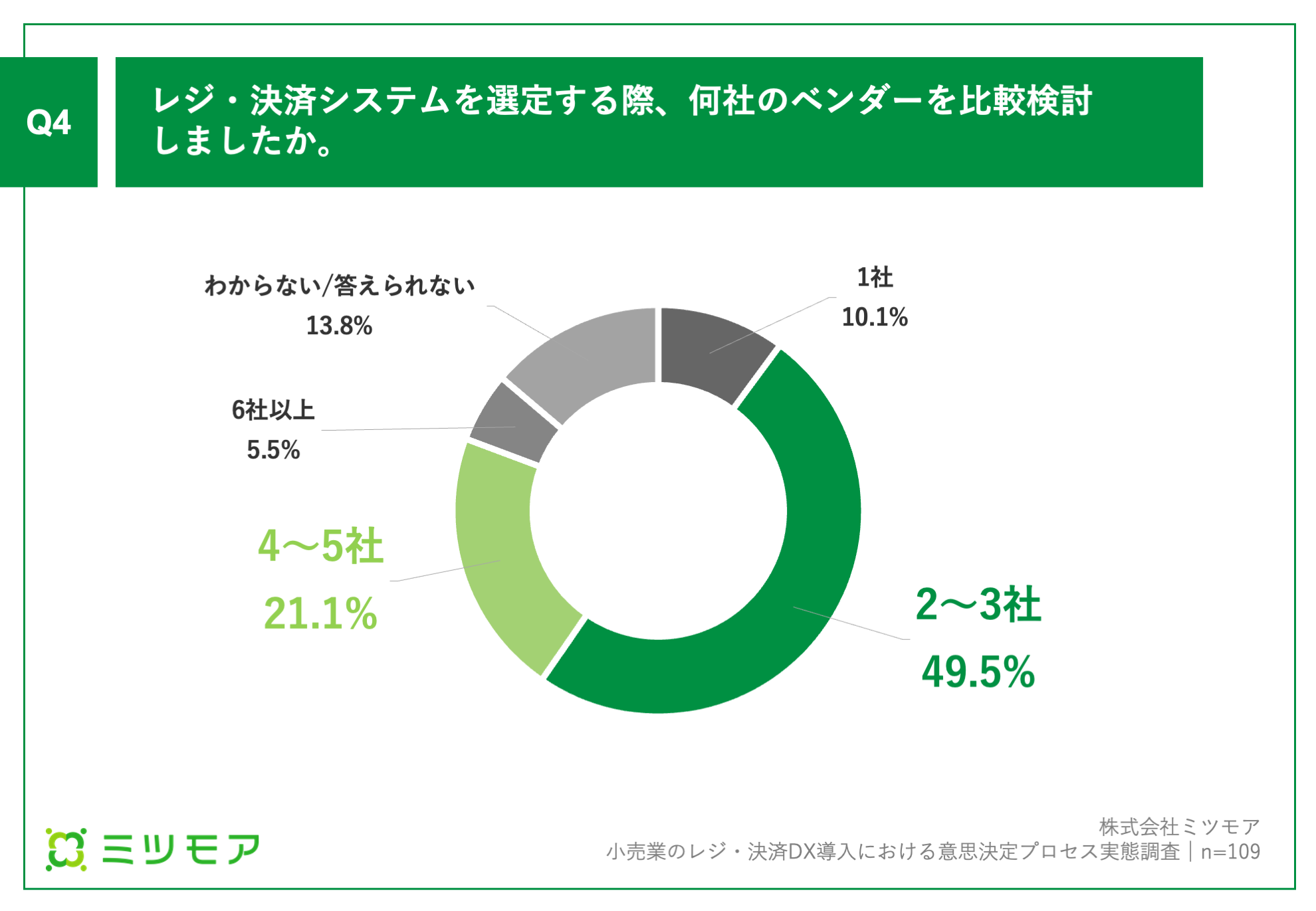 「Q4.レジ・決済システムを選定する際、何社のベンダーを比較検討しましたか。」(n=109)と質問したところ、「2~3社」が49.5%、「4~5社」が21.1%という回答となりました。