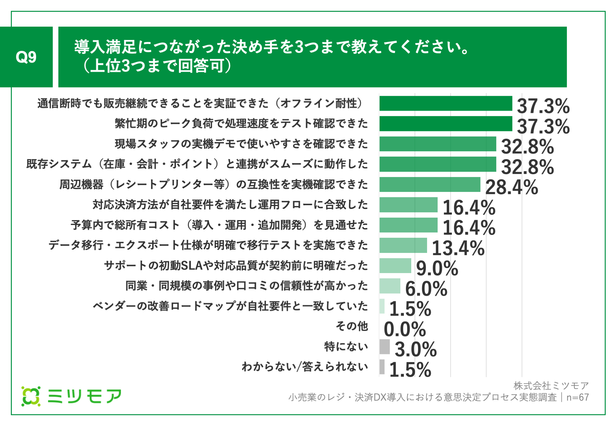 Q2で「非常に満足している」「やや満足している」と回答した方に、「Q9.導入満足につながった決め手を3つまで教えてください。(上位3つまで回答可)」(n=67)と質問したところ、「通信断時でも販売継続できることを実証できた(オフライン耐性)」が37.3%、「繁忙期のピーク負荷で処理速度をテスト確認できた」が37.3%という回答となりました。