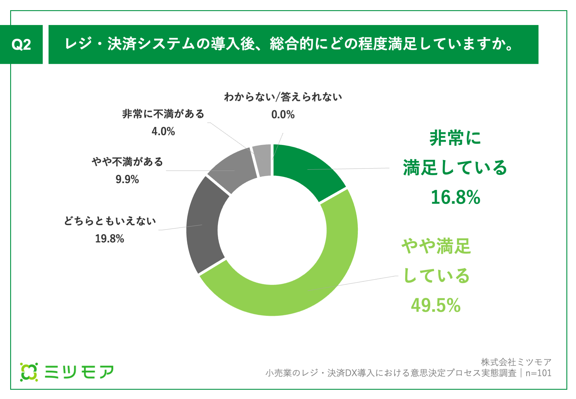 Q1で「わからない/答えられない」以外を回答した方に、「Q2.レジ・決済システムの導入後、総合的にどの程度満足していますか。」(n=101)と質問したところ、「非常に満足している」が16.8%、「やや満足している」が49.5%という回答となりました。