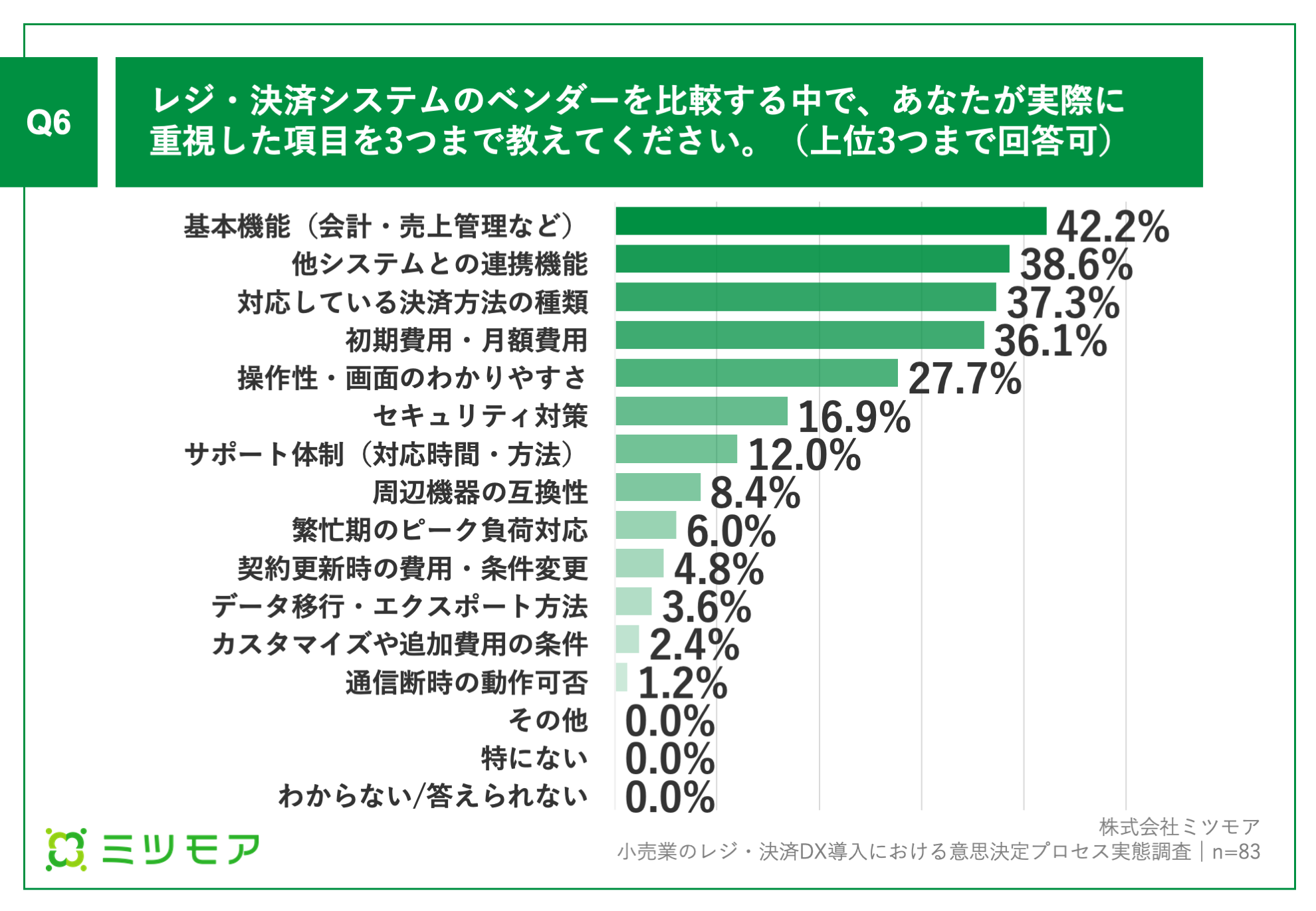 Q4で「2~3社」「4~5社」「6社以上」と回答した方に、「Q6.レジ・決済システムのベンダーを比較する中で、あなたが実際に重視した項目を3つまで教えてください。(上位3つまで回答可)」(n=83)と質問したところ、「基本機能(会計・売上管理など)」が42.2%、「他システムとの連携機能」が38.6%、「対応している決済方法の種類」が37.3%という回答となりました。