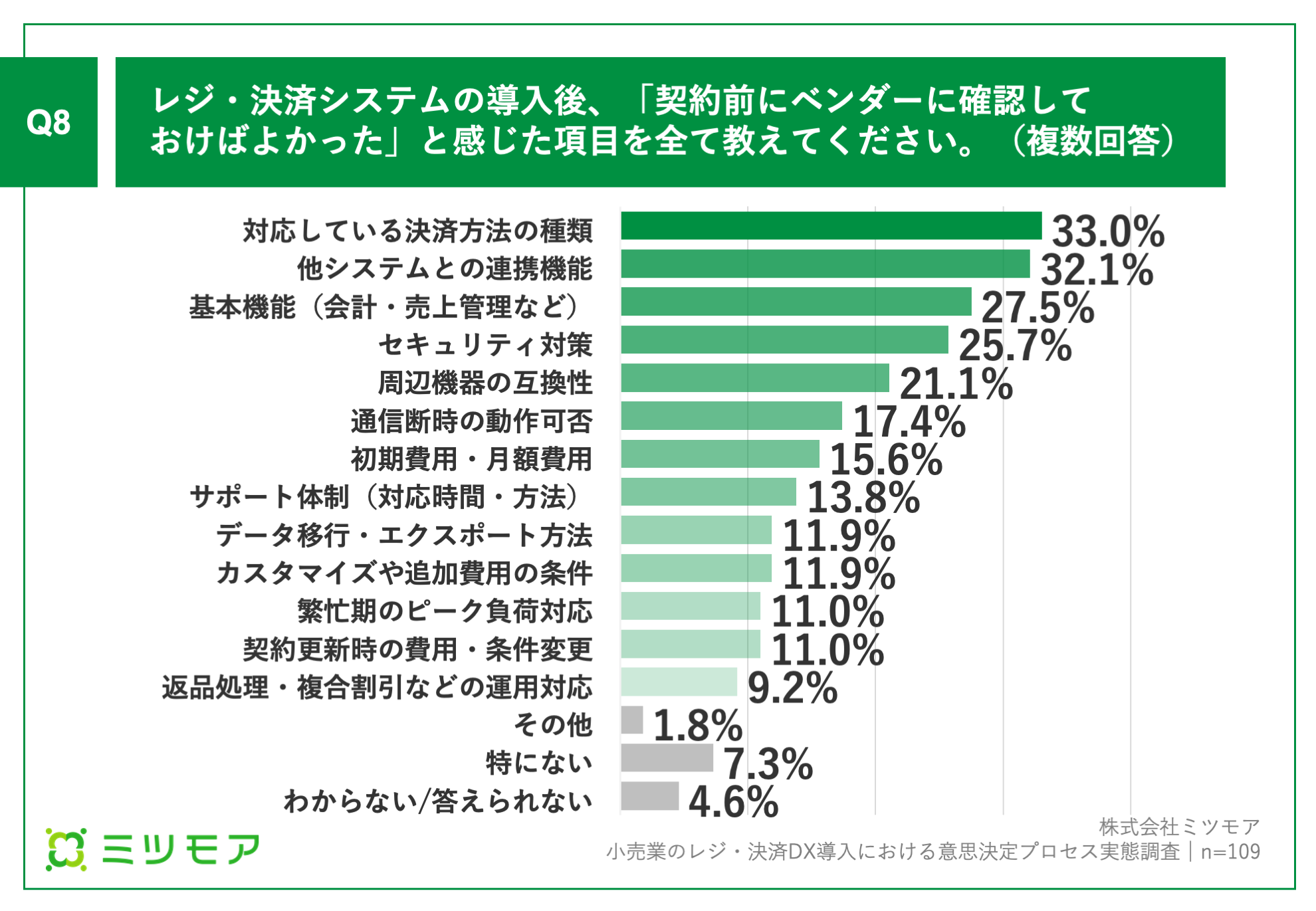 「Q8.レジ・決済システムの導入後、『契約前にベンダーに確認しておけばよかった』と感じた項目を全て教えてください。(複数回答)」(n=109)と質問したところ、「対応している決済方法の種類」が33.0%、「他システムとの連携機能」が32.1%、「基本機能(会計・売上管理など)」が27.5%という回答となりました。