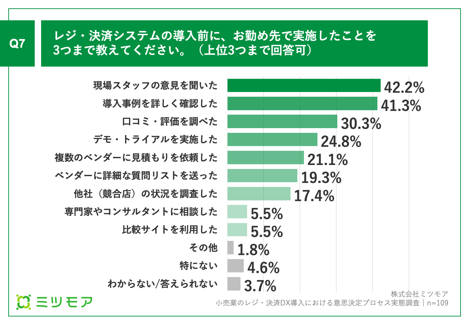 「Q7.レジ・決済システムの導入前に、お勤め先で実施したことを3つまで教えてください。(上位3つまで回答可)」(n=109)と質問したところ、「現場スタッフの意見を聞いた」が42.2%、「導入事例を詳しく確認した」が41.3%という回答となりました。