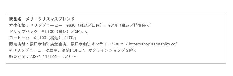シーズナルで登場する猿田彦のオリジナルブレンドは、12月のムードを盛り上げる、その名も「メリークリスマスブレンド」。今年のクリスマスブレンドは妖艶さとつややかさを意識。ワインを連想するカシスの風味と、華やかなローズの香り、きび砂糖の優しい甘さが特徴です。