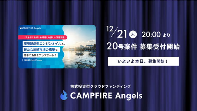 株式会社CAMPFIRE Startups(CAMPFIREグループ 本社:東京都渋谷区 / 代表取締役:出縄 良人 / 以下、当社 )の運営する、株式投資型クラウドファンディング「CAMPFIRE Angels(キャンプファイヤー エンジェルス)」。第20号案件として、独自開発の高性能エンジンオイル「スマートオイル」と、漁師と買い手が直接つながる新しい流通市場「ブルーフォーラム」で日本の漁業の業界課題を解決する「株式会社Fuel Efficiency」の株主募集を、本日12月21日(火)20:00より開始いたします。