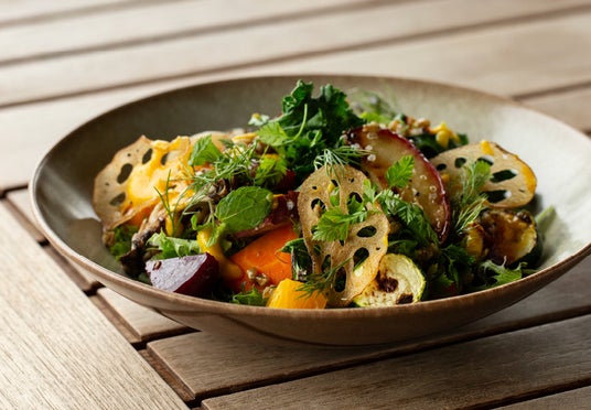 レタス、にんじん、かぼちゃ、さつまいも、ズッキーニ、ビーツ、蓮根などの野菜・フルーツ・ハーブ・ナッツ・穀物が入ったボリューム満点のサラダ。葉野菜は香ばしく焼き上げ、根菜は無水調理で甘みを引き出し、特製にんじんドレッシングで仕上げました。シェアしても、主食にしても満足感のある心も体も喜ぶサラダです。