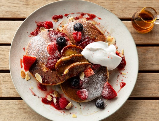 バーミキュラの特製パンケーキグリドル(鉄板)で香ばしく焼き上げた全粒粉のパンケーキはしっとり&ふわふわ。生地にはバターを使用せず、ホイップクリームは豆乳とココナッツを使用するなど、おいしさと健康にこだわりました。キャラメリゼしたフルーツは季節ごとに変わるので、いつ来ても楽しめます。※価格調整中