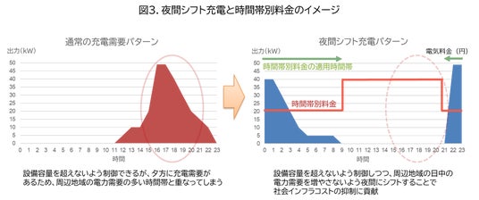 また、充電時間を夜間へシフトすることで電気料金がお得になる時間帯別電気料金を提供することで、EV導入に伴うお客さまの充電コスト抑制(図3)にも貢献いたします。