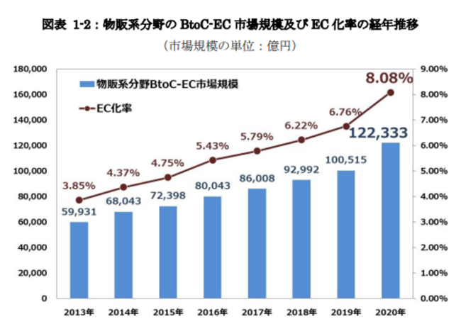 令和2年度(2020年)経済産業省の報告書*¹によると、物販系分野のBtoC ECの市場規模は前年比で伸長率20%を超える結果となりました。過去数年の伸長率が1桁台であったことからも2020年に大幅に拡大したことが分かります。また、EC化率においても2019年よりも向上しており、2013年からの7年間で約2倍に拡大しています。