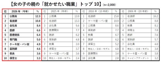 子どもの将来の安定を願う気持ちは毎年変わらず、今年も「公務員」が1位となりました。「会社員」は昨年よりポイントを落としたものの2位に定着。子どもの人気に連動して、「消防・レスキュー隊」は過去最高タイの4位となりました。一方、「医師」は5位、割合も5.9%と過去最少になりました。