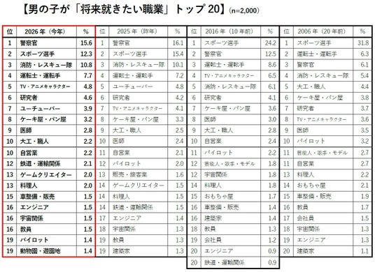 20年前との比較では、当時多くの男の子の憧れだった「スポーツ選手」が10.7ポイント減らして1位から3位に。男女両方で人気が高まっている「警察官」が6.7ポイント増やして7位から2位に上がりました。11位だった「消防・レスキュー隊」も3.9ポイント増やして4位に入り、人を助ける仕事への関心が高まっていることがうかがえました。