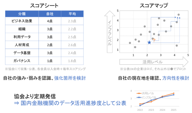 業界横断で交流しつつ、関係諸団体等との連携も深めながら、金融データ活用の在るべき組織の標準を策定していきます。具体的には、各金融機関によるセルフチェックが可能となる「データ活用組織チェックシート」(仮称)の制定を予定しています。また、制定後には、各金融機関のデータ活用組織状況を本チェックシートにより定点観測することで、データ活用に関して金融業界全体の底上げを図ってまいります。