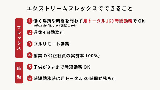 エクストリームフレックス制度は、コアタイムのないフレックス制度とカスタマイズした育児時短勤務制度を組み合わせた、エルボーズ独自の勤務制度です。