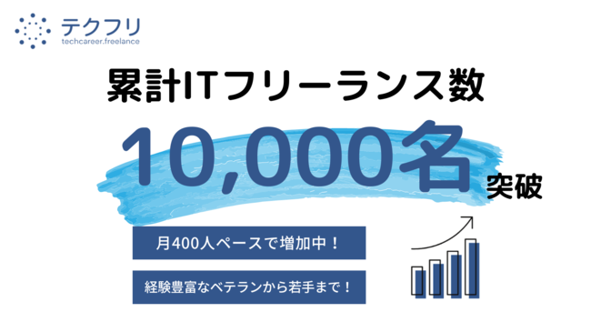 ITフリーランスエンジニアの案件・求人サイト「テクフリ」(https://freelance.techcareer.jp/)を運営する株式会社アイデンティティー(東京都新宿区、代表取締役:今野 力、以下「当社」)は、当社が保有するIT人材のデータベースにおいて、2022年10月にITフリーランスの数が10,000名を突破したことをお知らせします。