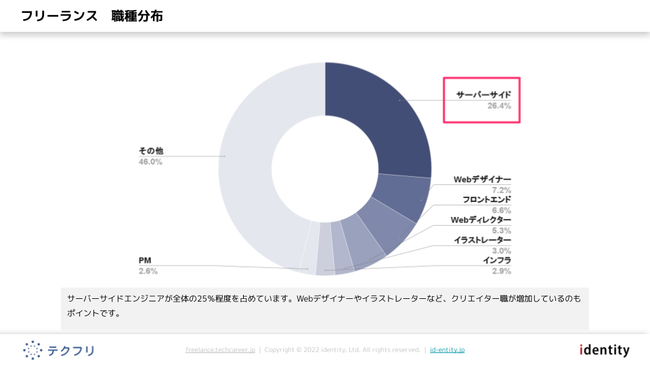 サーバーサイドエンジニアが全体の25%ほどを占めており、2番目に多いWebデザイナーの3倍以上となっています。