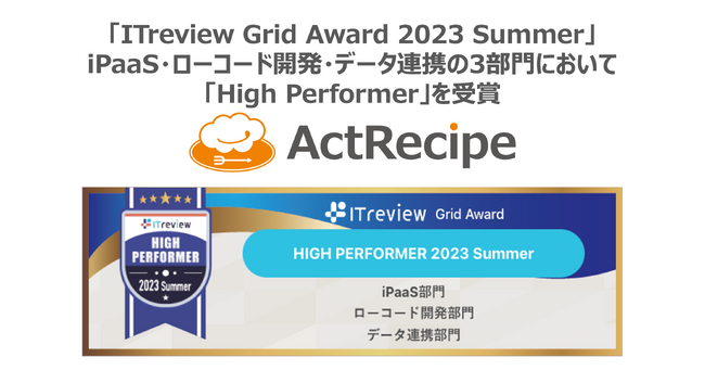 SaaSの連携によって業務の自動化を実現するエンタープライズiPaaS「ActRecipe」を提供するアクトレシピ株式会社(本社:東京都港区、代表取締役CEO:池上大介、以下「アクトレシピ」)は、アイティクラウド株式会社主催「ITreview Grid Award 2023 Summer」におきまして、ActRecipeがiPaaS部門・ローコード開発部門・データ連携部門において「High Performer」を受賞したことを発表します。