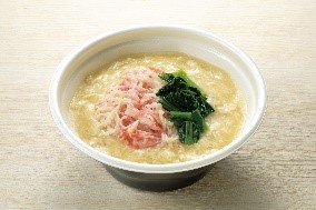 紅ずわいがにをトッピングしたスープご飯です。かきたまごと小松菜で彩りよく仕上げました。魚介の旨みがつまったとろみのあるスープで寒い時期にぴったりの商品です。