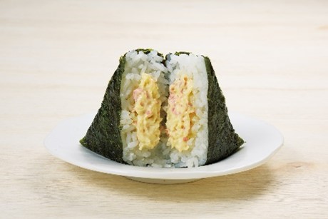 カニカママヨネーズ和えに、味のアクセントにごま油、わさびと醤油を加えた中具を使用しています。味付海苔を使用したおにぎりです。