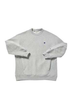 N.HOOLYWOOD とのコラボレーションによる、Champion を代表する製法の「REVERSE WEAVE(R)」を実験的に再構築し、「NEW WEAVE」と名付けたカプセルコレクション第二弾。着込むほどに独特の風合いや味わいが出る11.5oz(11.5オンス)の裏起毛素材を身体に沿った立体裁断で組み上げ、前身頃からスリーブの上部、後身頃にかけて一枚の生地で製作したクルーネックスウェットシャツです。ゆったりとしたワイドシルエットと、内側に入り込むような丸みを持たせたフォルムのスリーブが特長。両脇には「EXPANSION GUSSET(エクスパンションガゼット)」、カンガルーポケットの代わりにシームポケットを付けました。第二弾では、センターシームに仕様変更、ネック部分も1990年代のUSAチャンピオンのプロダクトにみられたユニークなレイヤードリブ(2重リブ)を採用、エルボーパッチを追加しています。