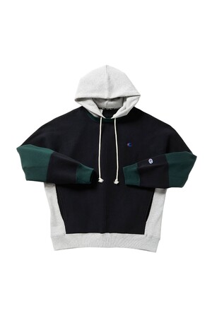 N.HOOLYWOOD とのコラボレーションによる、Champion を代表する製法の「REVERSE WEAVE(R)」を実験的に再構築し、「NEW WEAVE」と名付けたカプセルコレクション第二弾。着込むほどに独特の風合いや味わいが出る11.5oz(11.5オンス)の裏起毛素材を身体に沿った立体裁断で組み上げ、前身頃からスリーブの上部、後身頃にかけて一枚の生地で製作したフーデッドスウェットシャツです。ゆったりとしたワイドシルエットと、内側に入り込むような丸みを持たせたフォルムのスリーブが特長。両脇には「EXPANSION GUSSET(エクスパンションガゼット)」、カンガルーポケットの代わりにシームポケットを付けました。第二弾では、センターシームに仕様変更、ネック部分はリブの内側からフードを取り付けたデザインで、エルボーパッチを追加しています。