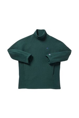 N.HOOLYWOOD とのコラボレーションによる、Champion を代表する製法の「REVERSE WEAVE(R)」を実験的に再構築し、「NEW WEAVE」と名付けたカプセルコレクション第二弾。着込むほどに独特の風合いや味わいが出る11.5oz(11.5オンス)の裏起毛素材を身体に沿った立体裁断で組み上げ、前身頃からスリーブの上部、後身頃にかけて一枚の生地で製作したハイネックスウェットシャツです。ゆったりとしたワイドシルエットとスリーブが特長。両脇に「EXPANSION GUSSET(エクスパンションガゼット)」を付けました。コレクション名の「NEW WEAVE」と両ブランドのロゴを入れた、コラボレーションを象徴するスペシャルな襟ネームが付きます。