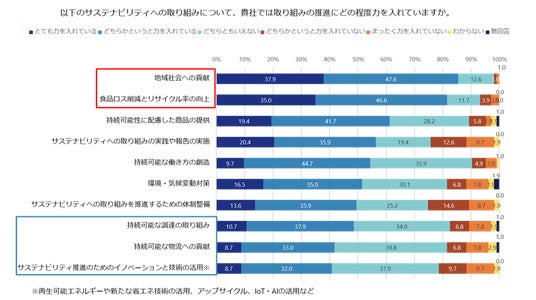 「とても力を入れている」と「どちらかというと力を入れている」の回答を合計すると、「地域社会への貢献」(85.5%)が最も多く、それに次いで「食品ロス削減とリサイクル率の向上」(81.6%)が続き、どちらも8割を超えている。