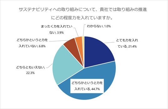 サステナビリティへの取り組み推進に「とても力を入れている」は21.4%、「どちらかというと力を入れている」は44.7%で、合わせて66.1%となり、取り組みが広がっていることがうかがえる。ただし、「とても力を入れている」だけ見ると約2割にとどまっており、依然として積極的に取り組んでいる企業は限られている。