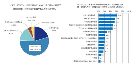 サステナビリティへの取り組みが事業や経営に良い影響を与えていると感じている企業は、「とても感じる」「どちらかというと感じる」と回答した企業を合わせて75.7%にのぼり、多くの企業がその効果を実感している。