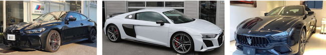 日常での快適性とサーキットでの高性能を備えたスポーツクーペ「BMW M4 Competition」、V型10気筒の大排気量エンジンを搭載したスーパースポーツカー「Audi R8」、イタリアを代表する魅惑のハイパワースポーツセダン「マセラティ ギブリ トロフィオ」
